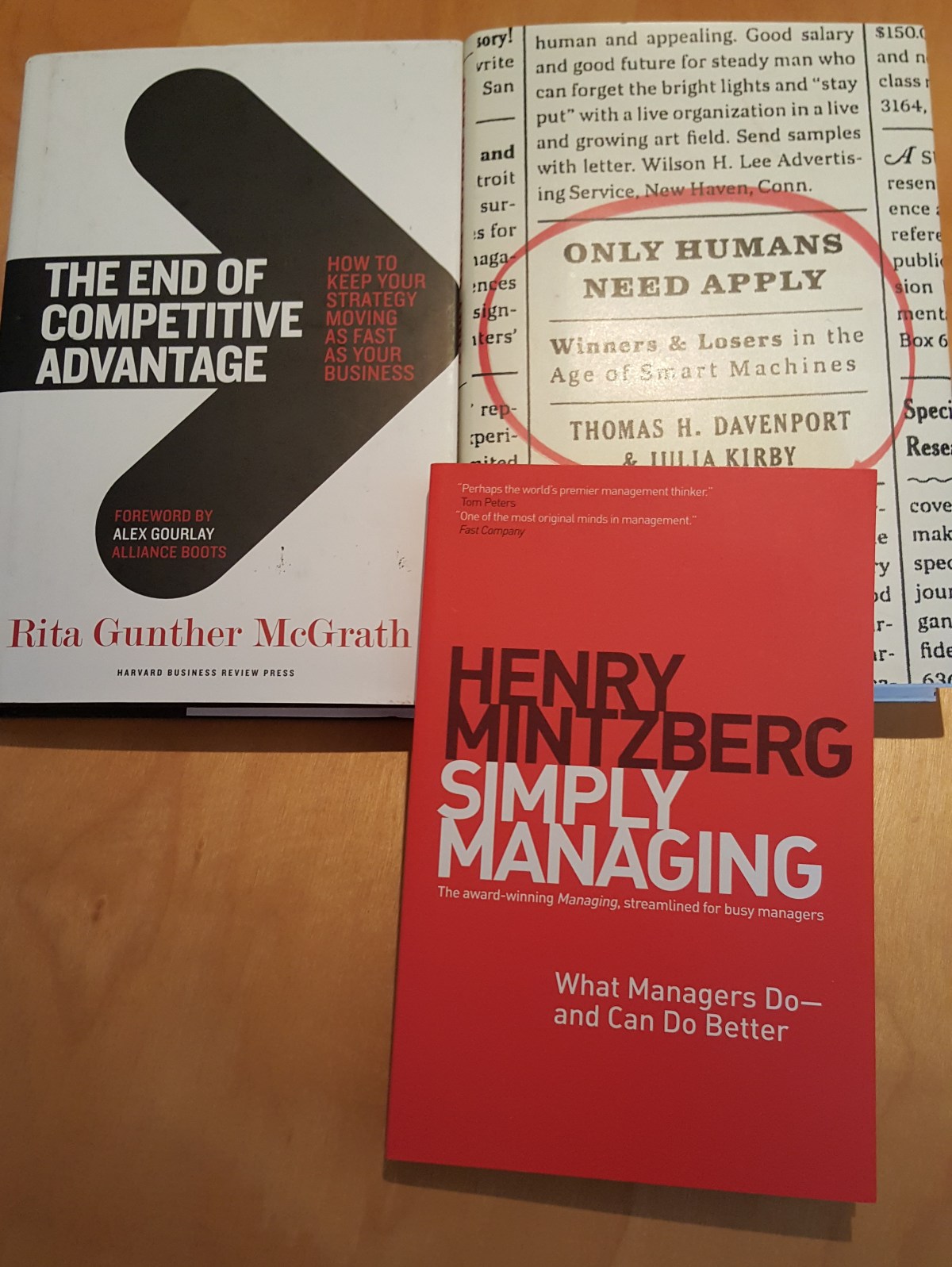 I’m not sure of the money and motivation behind this largesse but this week my three chosen books arrived: Only Humans Need Apply, The End of Competitive Advantage , Simply Managing. All I have to do now is read them.