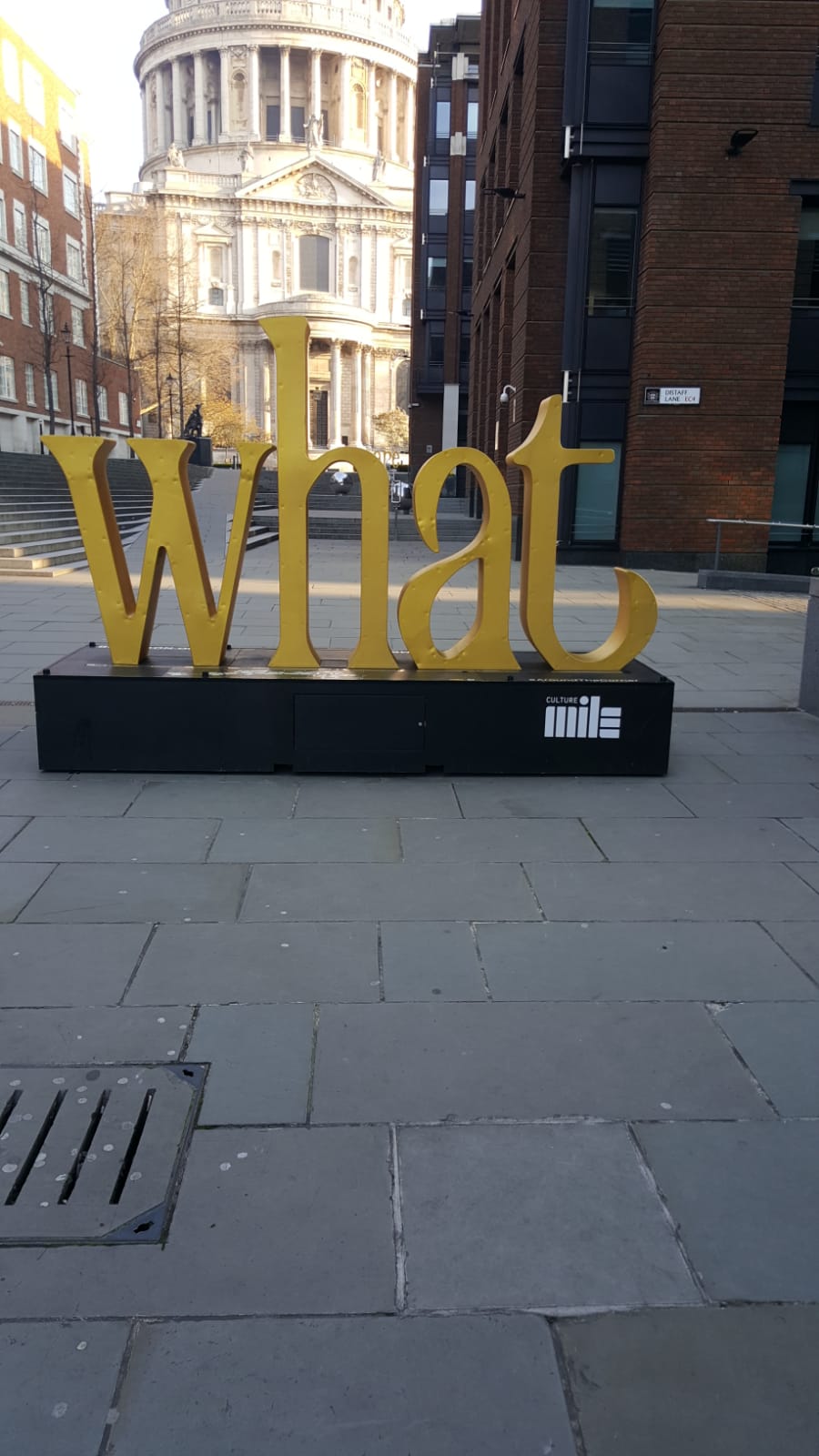 When I got home, I looked it up. It’s part of London’s Culture Mile wayfinding tour marked by artwork installations. The ‘What’ is the first on the route and comes from a sentence in Virginia Woolf’s novel Jacob’s Room: ‘What are you going to meet if you turn this corner?’ Each word in the sentence is at a different location on the culture mile.